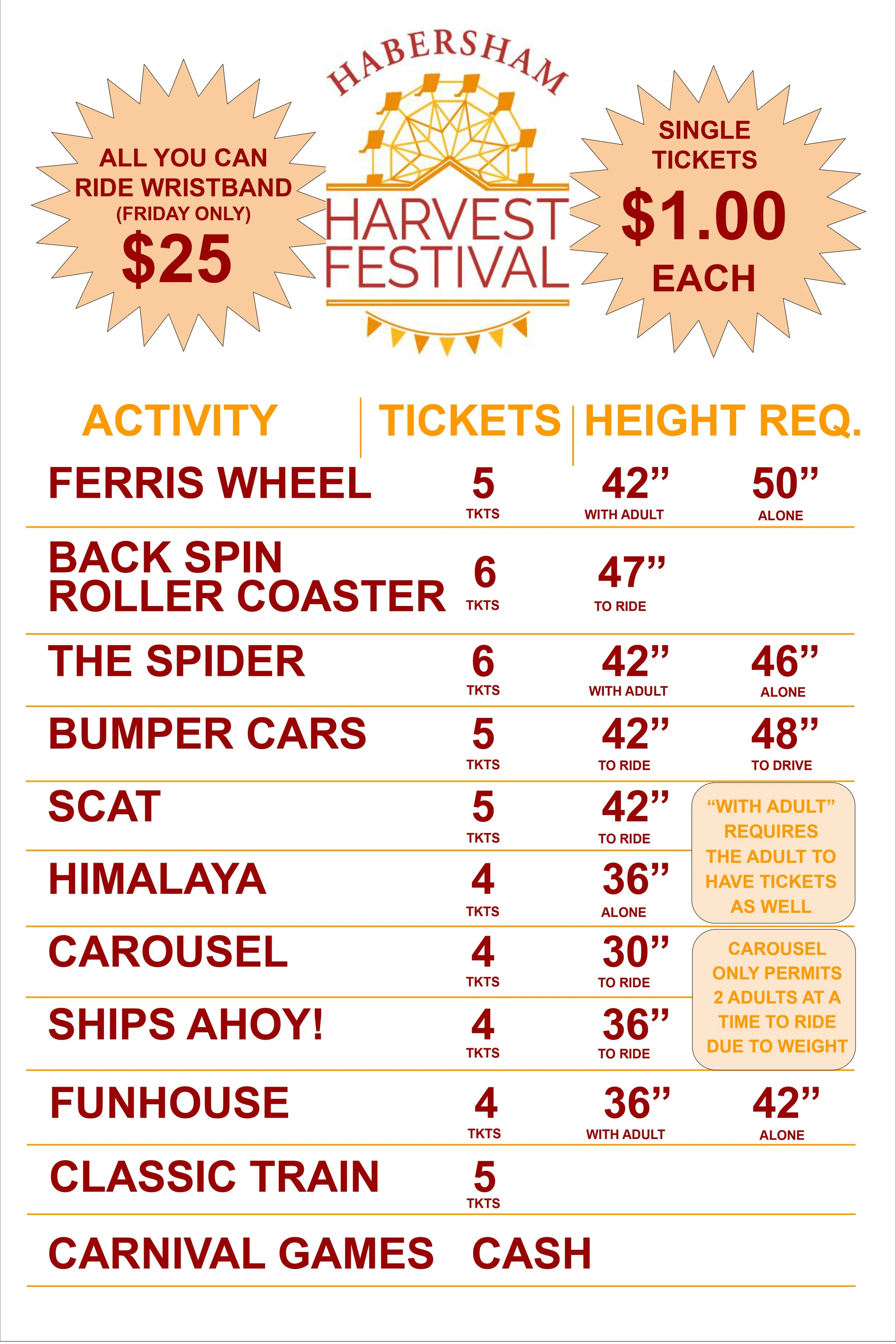 A: Habersham Harvest festival Admission is FREE. Select Rides, Attractions, and Activities require paid tickets. Event tickets cost $1 each and Rides, Attractions, and Activities range from 2-6 tickets. On FRIDAY NIGHT ONLY we will offer a discounted all-you-can-ride wristband deal. Food and Games are cash only.